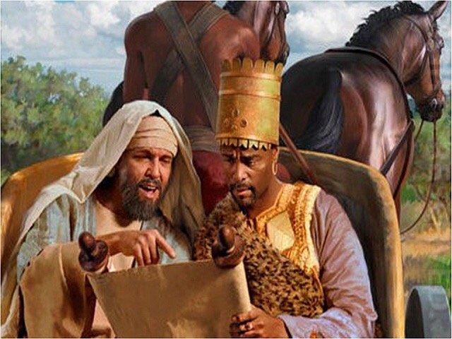 “26 An angel of the Lord spoke to Philip: “Get up and go south to the road that goes down from Jerusalem to Gaza.” (This is the desert road.) 27 So he got up and went. There was an Ethiopian man, a eunuch and high official of Candace, queen of the Ethiopians, who was in charge of her entire treasury. He had come to worship in Jerusalem 28 and was sitting in his chariot on his way home, reading the prophet Isaiah aloud.